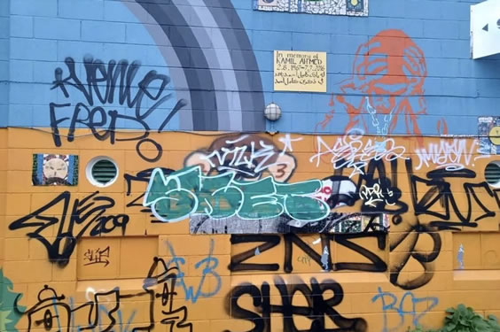 Large sections of the mural are now completely submerged in graffiti. The mural also contains three plaques explaining the significance of the piece and why it was created, which were also partially spray painted.